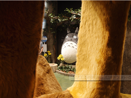 店頭には、「となりのトトロ」の「大トトロ」と「ネコバス」がお目見えした。「大トトロ」の周りには作品のワンシーンをモチーフに、雨が降る情景を絵にしたバックボードと「稲荷前」と書かれたバス停を設置。ショップでは初登場の大きな「ネコバス」は目の部分が光るほか、行き先部分に「名古屋(「屋」の文字は逆さに表示)」と書かれている。中に入って外を見ると、ネコバス越しに「大トトロ」を見ることができる。